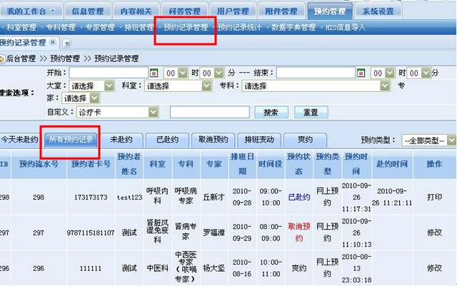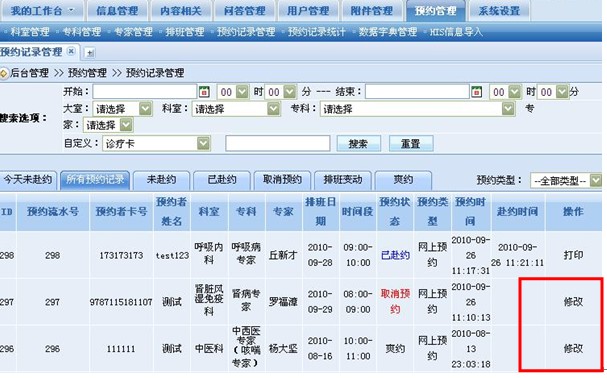 在開診當(dāng)天,醫(yī)院醫(yī)務(wù)人員可以根據(jù)實(shí)際門診赴約的情況進(jìn)行預(yù)約信息的修改,可以為準(zhǔn)時(shí)赴約的患者打印出預(yù)約單并將信息改為“已赴約”,將未赴約的患者信息改為“爽約”……系統(tǒng)將可以協(xié)助醫(yī)院對(duì)全部的預(yù)約信息進(jìn)行有效的管理和歸類。