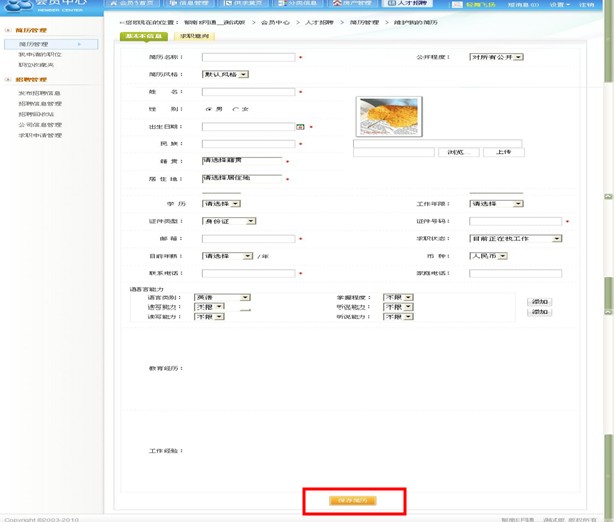 點(diǎn)擊“簡(jiǎn)歷管理”,就可看到系統(tǒng)為我們提供了兩種簡(jiǎn)歷模板——應(yīng)屆畢業(yè)生簡(jiǎn)歷模板和標(biāo)準(zhǔn)簡(jiǎn)歷,非常人性化的滿足不同應(yīng)聘者的實(shí)際需求。我們可以根據(jù)自己的情況選擇簡(jiǎn)歷模板,這里我們就以標(biāo)準(zhǔn)簡(jiǎn)歷為例繼續(xù)以下的流程。