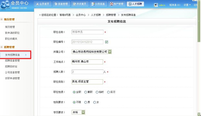 在會(huì)員中心“招聘管理”內(nèi)選擇“發(fā)布招聘信息”,按照選項(xiàng)填寫招聘信息就后提交就可以了。