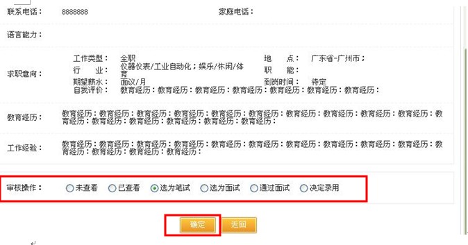 根據(jù)應(yīng)聘者是否滿足企業(yè)需要的情況,我們可以對(duì)求職信息進(jìn)行相應(yīng)的操作,比如:已查看,選為面試,面試通過等操作,非常方便的幫助我們對(duì)大量的應(yīng)聘信息進(jìn)行分類處理。