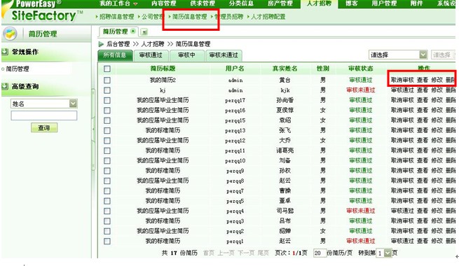 首先讓我們進(jìn)入網(wǎng)站后臺(tái)的人才招聘版塊,點(diǎn)擊“簡(jiǎn)歷信息管理”,前臺(tái)的簡(jiǎn)歷信息便一目了然了,我們看到在“操作”一欄中系統(tǒng)提供了多種信息處理操作選項(xiàng),我們可以根據(jù)實(shí)際需求進(jìn)行信息處理。如圖: