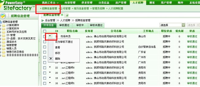要想處理招聘信息,點(diǎn)擊“招聘信息管理”就可以了,右擊最左側(cè)的小三角形,便出現(xiàn)了我們?cè)趫D中看到的選項(xiàng),我們可以根據(jù)需要進(jìn)行相應(yīng)的信息處理。