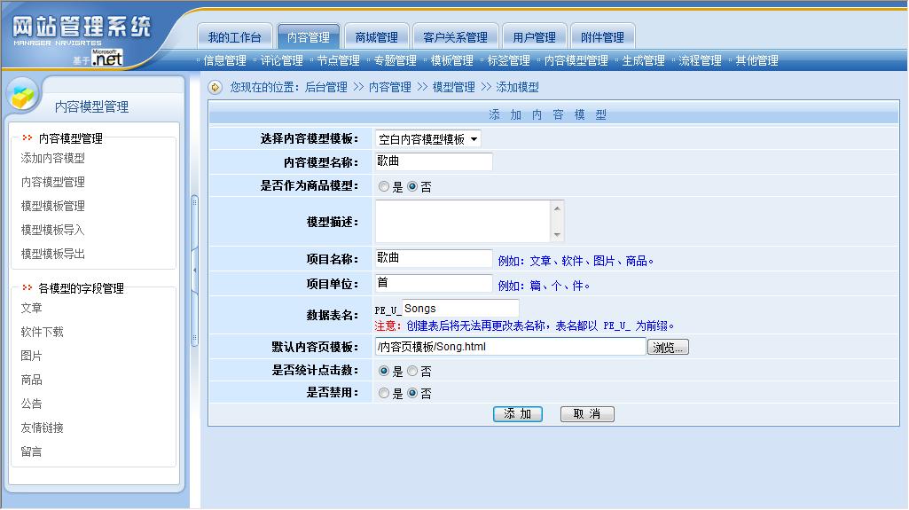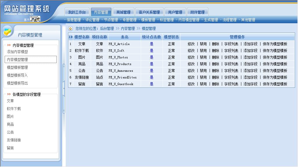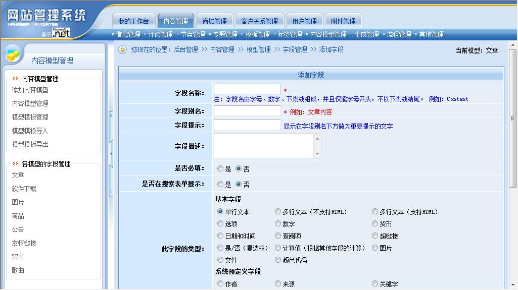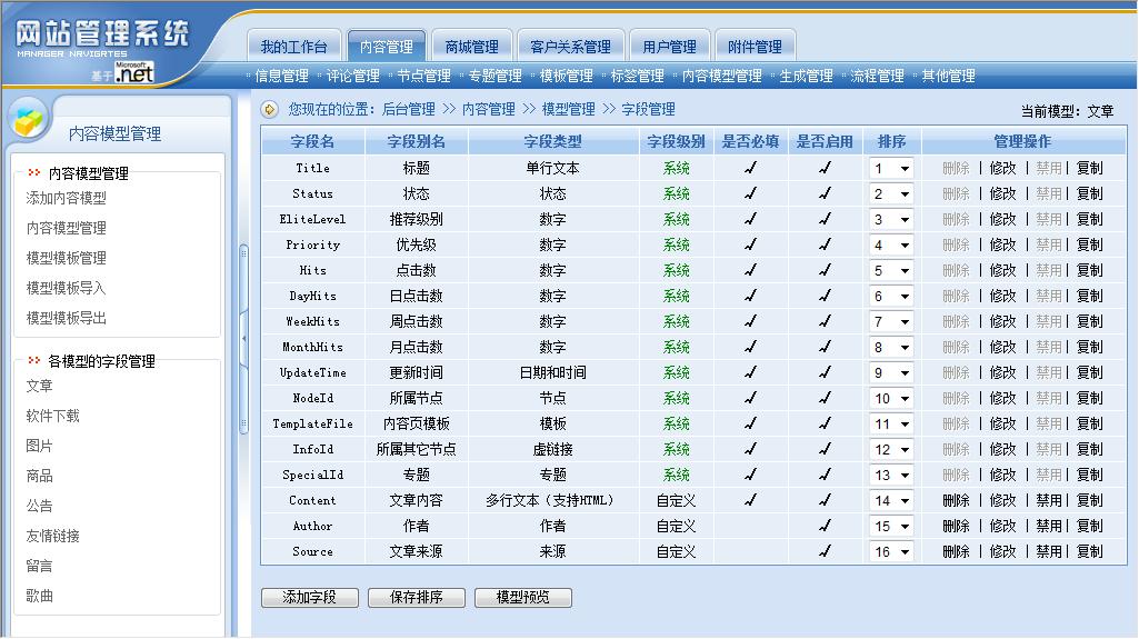 內(nèi)容模型就是將系統(tǒng)原來(lái)的“文章”、“下載”、“圖片”、“商品”、“公告”、“友情鏈接”、“留言”、“供求信息”、“房產(chǎn)信息”等功能模塊統(tǒng)一抽象為“內(nèi)容模型”,所有模型的所有字段都可以由站長(zhǎng)進(jìn)行控制。動(dòng)易CMS 2007版系統(tǒng)會(huì)內(nèi)置“文章”、“下載”、“圖片”、“商品”、“公告”、“友情鏈接”、“留言”、“供求信息”、“房產(chǎn)信息”等常用內(nèi)容模型(可能會(huì)根據(jù)版本不同而有所區(qū)別)以方便用戶直接使用。站長(zhǎng)也可以根據(jù)需要,隨時(shí)添加新的內(nèi)容模型,如:可以添加Flash模型、影視模型、音樂(lè)模型、課件模型、教案模型……等等,需要什么內(nèi)容模型就可以添加和創(chuàng)建什么內(nèi)容模型。當(dāng)然,站長(zhǎng)也可以隨時(shí)修改、刪除或禁用系統(tǒng)已有的內(nèi)容模型。對(duì)于內(nèi)置的內(nèi)容模型,站長(zhǎng)也可以對(duì)模型的字段進(jìn)行管理(包括添加、刪除、修改、排序等管理操作)。