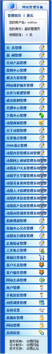 這樣的設計在頻道數(shù)目比較少時,還是比較清晰的。但是當頻道數(shù)目一多時,超級管理員登錄后臺就會眼花繚亂的。大家看看動易官方網(wǎng)站的后臺就知道了。