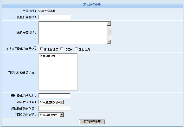 在動易SiteFactory 中,我們只要創(chuàng)建幾個用戶組,例如信息組、采購組、物流組這樣幾個組,然后創(chuàng)建待處理、配貨中、已配貨、發(fā)貨中、已發(fā)貨等幾個狀態(tài)碼。然后創(chuàng)建“訂單處理流程”,設置每個步驟中可操作的用戶組、經(jīng)過該步驟處理訂單狀態(tài)發(fā)生的變化等。就可以完全實現(xiàn)和互動出版社一樣的工作流程。