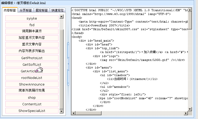 06版本的模板編輯,使用了可視化的在線編輯器,通過右鍵的快捷方式,可以快速的編輯和修改模板和標(biāo)簽代碼,但這種編輯器有一個(gè)重大的弱點(diǎn),就是不夠規(guī)范,它經(jīng)常會自作主張的修改用戶輸入的源代碼,使其不能符合用戶的要求,舉個(gè)簡單的小例子: