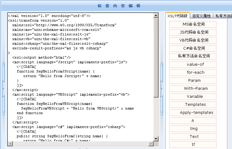 動易 SiteFactory :標(biāo)簽?zāi)0蹇梢允褂肅#,VB, JavaScript和標(biāo)準(zhǔn)的XSLT語句,對數(shù)據(jù)進(jìn)行處理輸出,下圖中就是同時(shí)在標(biāo)簽編輯器里使用三種不同程序語言的示例:
