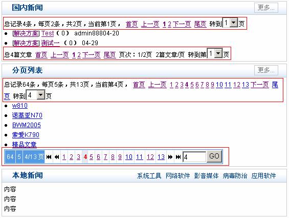 下圖是動易 SiteFactory 實(shí)現(xiàn)的同頁面多分頁標(biāo)簽并存的示例,其中紅框標(biāo)出的分頁標(biāo)簽都能對自己的數(shù)據(jù)源標(biāo)簽進(jìn)行分頁,且互不干擾: