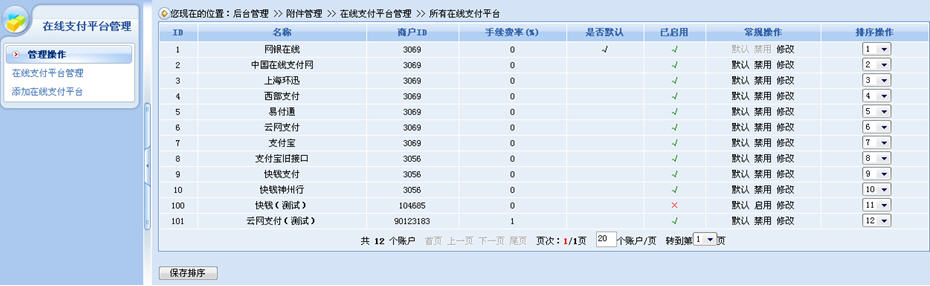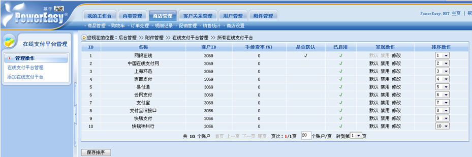 在動易eShop2007里,系統(tǒng)可添加的支付平臺數(shù)量是沒有上限的,網(wǎng)店可以任意添加多個支付平臺。此外,我們還可對支付平臺的先后順序進(jìn)行排序管理。