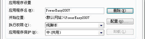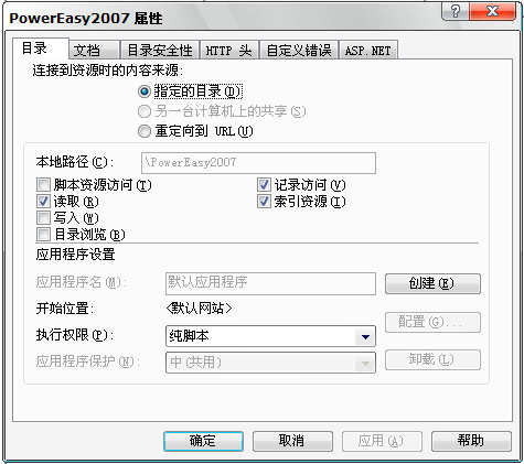郁悶,為啥呢?“默認(rèn)網(wǎng)站”的屬性配置都沒問題的,研究半天后,打開了IIS里的虛擬目錄“PowerEasy2007”的屬性配置窗口。