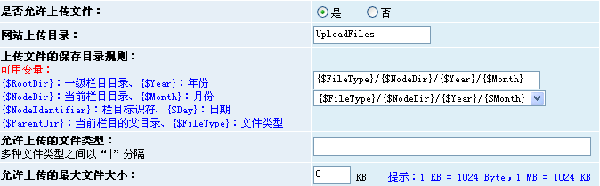 從圖中可以看出,除了上傳文件管理能夠?qū)Ρ4娴奈募M(jìn)行分類外,還能夠控制上傳功能開關(guān)、上傳文件類型和文件大小。另外,上傳文件管理功能配合系統(tǒng)內(nèi)置的上傳文件過濾功能,可謂是對(duì)上傳了進(jìn)行了全方位的管理了。