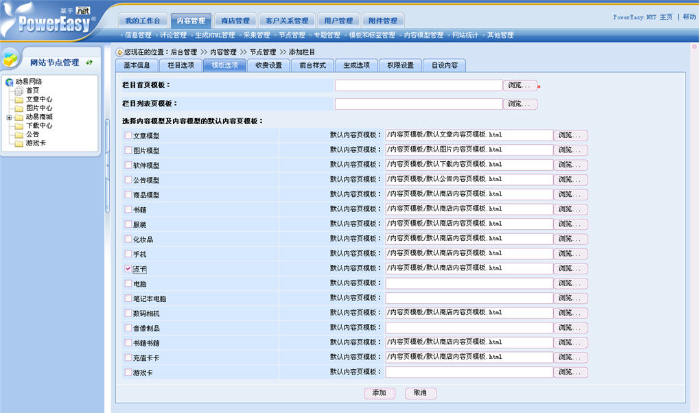 建好商品模型之后,我們還需要在商城下添加一個(gè)游戲充值卡的商品欄目,并選擇設(shè)置好該欄目的內(nèi)容模型(即商品模型)與欄目模板。