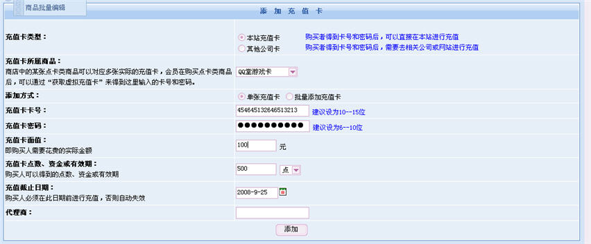 最后就是需要添加充值卡了,需要到“充值卡管理”里面添加單張充值卡或者批量生成充值卡。需要注意的是要正確選擇充值卡所屬商品,也就是所生成的充值卡要對(duì)應(yīng)屬于上面所添加的充值卡商品,否則充值卡將無(wú)法正常出售。另外“充值卡點(diǎn)數(shù)、資金或有效期”也要注意要與所屬商品中所描述的點(diǎn)數(shù)相同。