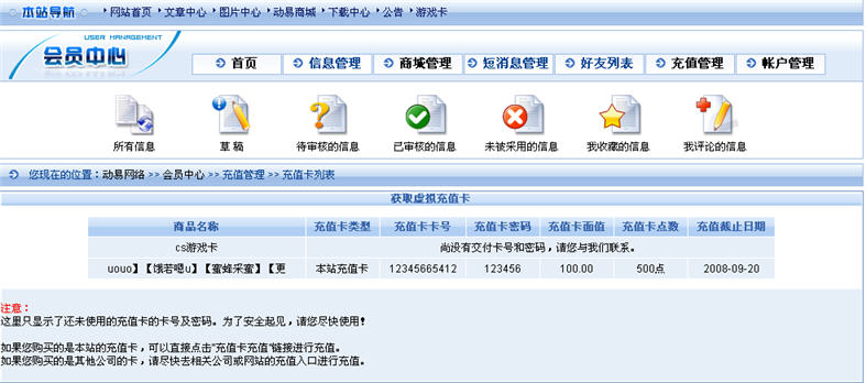 好了,以上步驟全部完成后,充值卡就可以在前臺(tái)商城中出售了,客戶可以像購(gòu)買其他商品一樣購(gòu)買充值卡,而且動(dòng)易eShop2007還具備自動(dòng)交付充值卡的功能??蛻粼谥Ц锻戤呚浛詈?,管理員在后臺(tái)訂單管理頁(yè)面可以直接點(diǎn)擊“交付充值卡”來(lái)發(fā)貨,隨后客戶即可在前臺(tái)會(huì)員中心里直接提取到充值卡卡號(hào)和密碼。