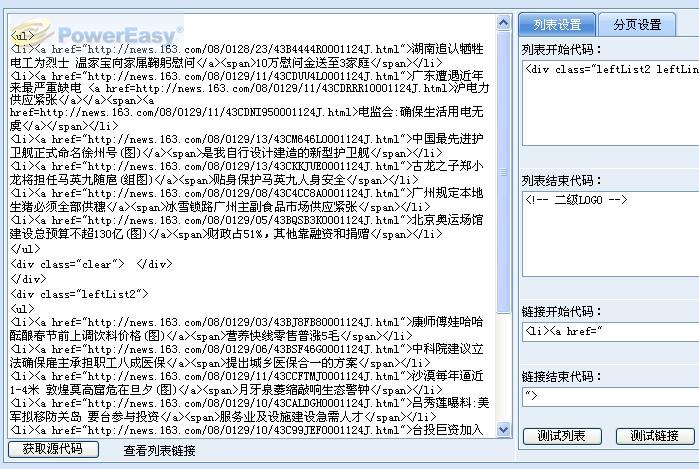 這里說的即時(shí)顯示指的是無刷新即看見采集的效果,所有的采集規(guī)則都可以通過AJAX效果進(jìn)行預(yù)覽。比如我們采集  的國(guó)內(nèi)新聞列表,當(dāng)我們?cè)O(shè)置好列表采集規(guī)則后,點(diǎn)擊“測(cè)試列表”和“測(cè)試鏈接”我們就可以直接在左邊預(yù)覽到采集后的效果(如下圖)。