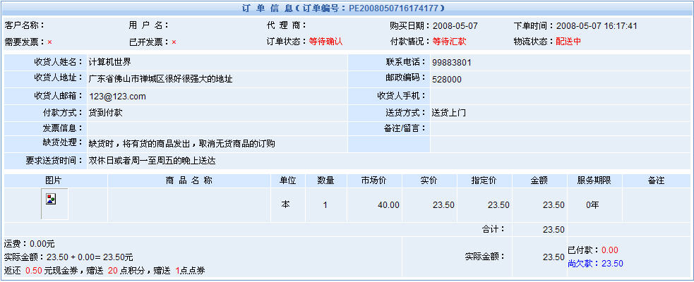 當(dāng)游客訂購商品并完成支付后,游客將獲得一個(gè)唯一的訂單編號(hào)。游客可在網(wǎng)店頁面中通過訂單編號(hào)與收貨人姓名查詢自己的訂單情況,如:訂單的商品列表、商品單價(jià)總價(jià),付款情況等,游客可以通過網(wǎng)絡(luò)隨時(shí)查詢并知道自己的訂單被受理了嗎?訂單是否已經(jīng)開始配送?同時(shí),游客不用擔(dān)心自己的訂單資料泄露出去,因?yàn)橛唵尉幪?hào)和收貨人姓名必須完全正確才能夠查詢訂單。