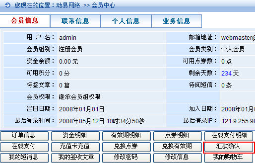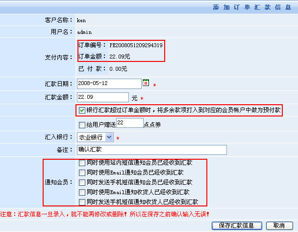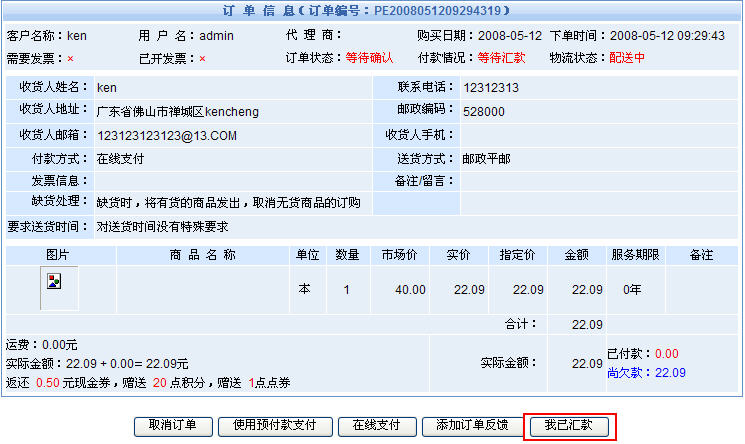 另外一個(gè)匯款確認(rèn)的功能按鈕則是為商品訂單獨(dú)立設(shè)計(jì)的:會(huì)員的訂單信息——>點(diǎn)擊“我已匯款”按鈕——>添加該筆訂單的匯款確認(rèn)信息,見下圖: