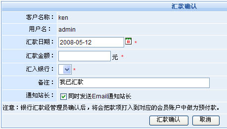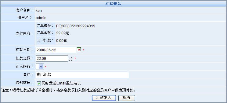 當(dāng)管理員確認(rèn)完這筆匯款信息后,我們的系統(tǒng)將自動(dòng)進(jìn)行訂單處理:1)若訂單全額付款完畢,則訂單狀態(tài)變?yōu)橐呀?jīng)付清。2)若訂單未支付完畢,則訂單狀態(tài)顯示為已收定金。3)若匯款額超過訂單金額,則系統(tǒng)會(huì)自動(dòng)將多余款項(xiàng)打入到對(duì)應(yīng)的會(huì)員帳戶中作為預(yù)付款。