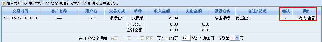 會(huì)員顧客發(fā)出匯款確認(rèn)信息后,網(wǎng)店管理員登錄后臺(tái)后可前往商店管理——>明細(xì)記錄——>資金明細(xì),查看到這條匯款確認(rèn)的記錄并可進(jìn)行確認(rèn)操作,見下圖: