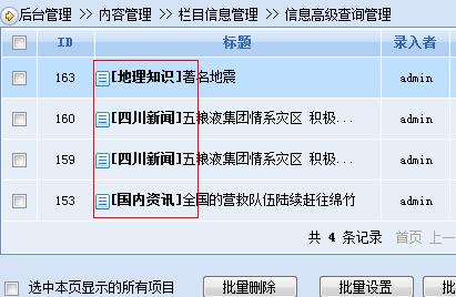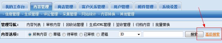通過(guò)內(nèi)容管理的信息管理進(jìn)入到信息管理界面,在常規(guī)操作菜單我們能夠看到“高級(jí)搜索”的按鈕,點(diǎn)擊即可進(jìn)入到新功能的操作界面: