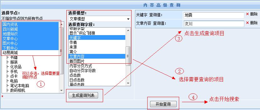 第三步:選擇模型后系統(tǒng)會(huì)自動(dòng)列出該模型下所有的字段,包括自定義字段。選擇我們需要查詢(xún)的項(xiàng)目,這里選擇“關(guān)鍵字”和“文章內(nèi)容”進(jìn)行搜索,并填寫(xiě)好查詢(xún)的內(nèi)容。