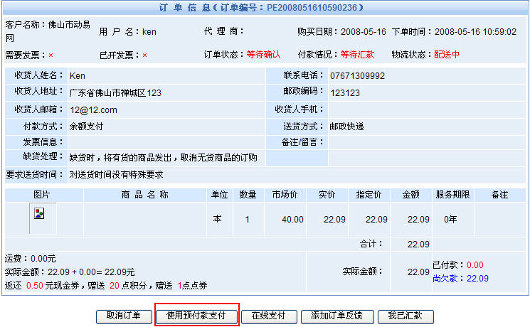 拍拍、財付通、淘寶等都有這么一個功能,當使用帳戶余額進行支付的時候,系統(tǒng)提示輸入你的支付密碼,也就是將用戶的登錄密碼和資金的支付密碼獨立了開來,這樣可以更好的保護用戶的資金安全。在SiteFactory eShop1.1里,我們也做了這樣的處理。下面我們通過截圖來看看這個功能是如何運作的。