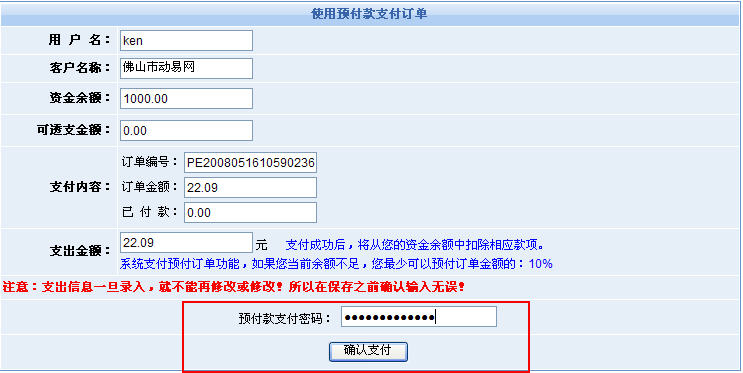 2、當用戶使用預付款(帳戶余額)進行支付的時候,系統(tǒng)將要求輸入支付密碼: