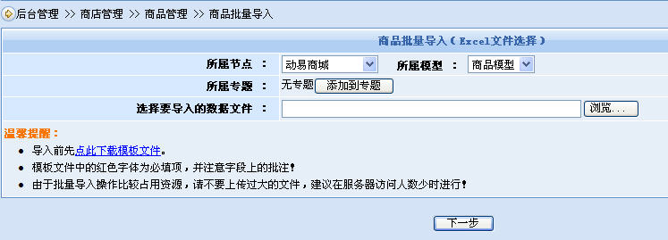 圖1是商品批量導入的操作首頁。我們看到,這里將商品所屬的節(jié)點與模型、專題獨立在商品列表(列表采用Excel文件保存)之外,即每個商品列表將只可一次導入到一個節(jié)點的某一個模型或某個商品專題之中。