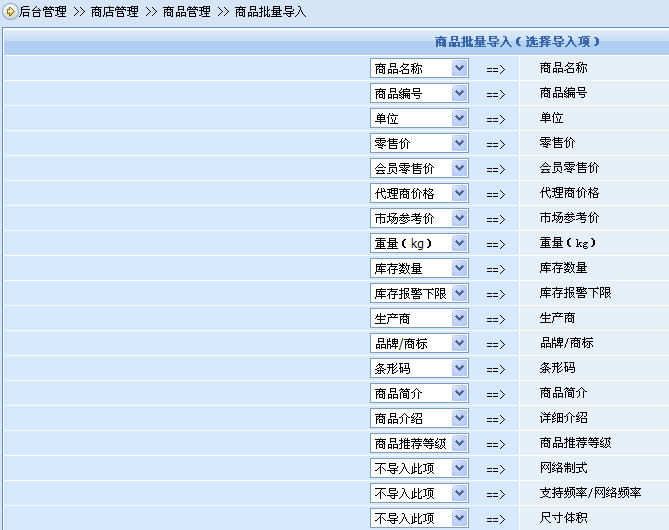 通過圖2,我們看到,excel表格里的的字段會自動對應(yīng)到商品模型的字段去。是的,這里說的是自動,系統(tǒng)根據(jù)字段名稱進行匹配而不是根據(jù)位置進行匹配(要求字段名稱的文字完全一致)。這意味著,我們可以很輕松地自己設(shè)計excel文件的表格模板。需要注意的是,商品名稱、商品零售價格等幾個字段是必須字段,在自己設(shè)計的excel表格模板里不可缺少,否則將出錯。