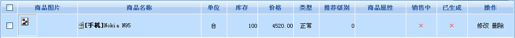 圖3,成功導入商品Nokia N95。我們看到,上圖商品的銷售中、已生成的狀態(tài)為“否”,這是因為在SF eShop 1.1 的批量上傳功能里,我們只允許商家進行商品信息添加而不可進行商品的銷售管理。要進行銷售管理,我們必須回到商品管理中,使用批量管理工具或逐個地管理商品的銷售狀態(tài)。而這個步驟我們就不截圖演示了。