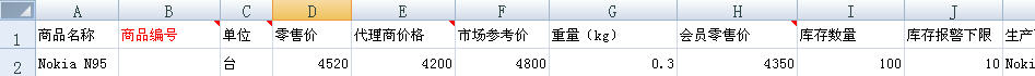 下載模板文件(Products.xls),并根據(jù)模板格式添加商品數(shù)據(jù)。我添加了1條數(shù)據(jù):Nokia N95。