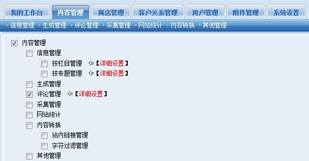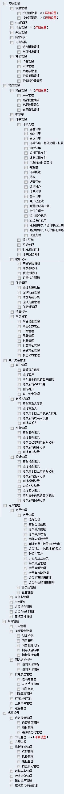 此外,樹(shù)狀目錄中的權(quán)限還配備了“詳細(xì)配置”的功能,為角色分配權(quán)限提供了更多種的配置途徑。下一節(jié)我們將以“信息管理”子模塊下的“按欄目管理”三級(jí)權(quán)限的詳細(xì)設(shè)置來(lái)進(jìn)行介紹節(jié)點(diǎn)的權(quán)限設(shè)置。