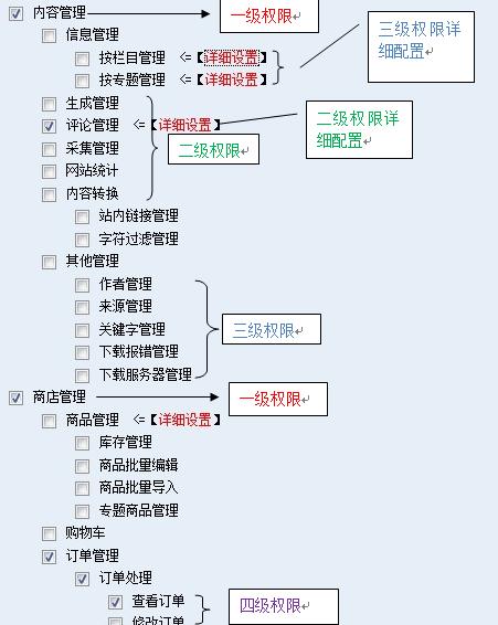 從圖中我們可以看到,SiteFactory? 的角色權(quán)限可細(xì)分到四級(jí),每級(jí)權(quán)限都是上一級(jí)權(quán)限的再細(xì)分,如此龐大但聯(lián)系緊密的樹(shù)狀權(quán)限結(jié)構(gòu)就是“SiteFactory? 樹(shù)狀四級(jí)權(quán)限”。圖中“商品管理”——“訂單管理”——“訂單處理”——“查看訂單”的四級(jí)權(quán)限細(xì)分過(guò)程,直觀體現(xiàn)出了分工越來(lái)越細(xì)化的特點(diǎn),不僅讓網(wǎng)站單調(diào)的權(quán)限與現(xiàn)實(shí)社會(huì)分工細(xì)化的趨勢(shì)相互掛鉤起來(lái),而且進(jìn)一步證明基于標(biāo)準(zhǔn)RBAC模型(角色)的訪問(wèn)控制方法的優(yōu)勢(shì)所在。相信采用角色來(lái)處理權(quán)限的SiteFactory? 更能適應(yīng)政府、事業(yè)單位、企業(yè)等日常部門(mén)較多、分工較細(xì)化領(lǐng)域的需求。