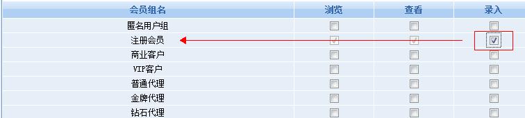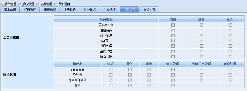 上圖是我們?cè)谛绿砑庸?jié)點(diǎn)時(shí)權(quán)限設(shè)置的界面,可以看到我們可以分別給會(huì)員組和角色設(shè)置此節(jié)點(diǎn)的相關(guān)權(quán)限。會(huì)員組是前臺(tái)會(huì)員的權(quán)限,角色是后臺(tái)管理的權(quán)限。如果我們希望前臺(tái)的注冊(cè)會(huì)員能夠在會(huì)員中心添加此節(jié)點(diǎn)的信息,則可以在圖中勾上“錄入”權(quán)限(如下圖):