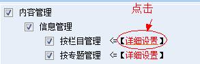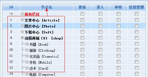 將角色賦予“信息管理”權(quán)限后,就可以設(shè)置上圖中“此角色”在各個(gè)欄目節(jié)點(diǎn)中的相關(guān)權(quán)限了,包括查看、錄入、審核、信息管理權(quán)限。