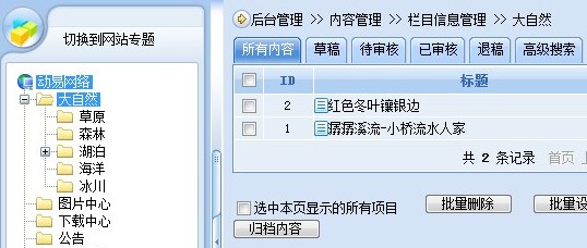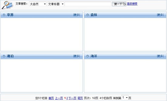 最后,瀏覽前臺(tái)可以看到,雖然沒(méi)有設(shè)置“欄目首頁(yè)模板”,但“大自然”欄目依然分頁(yè)顯示出了其子欄目,如下圖所示: