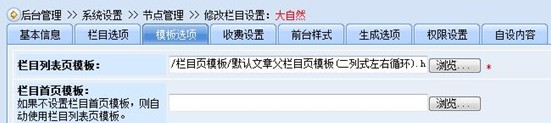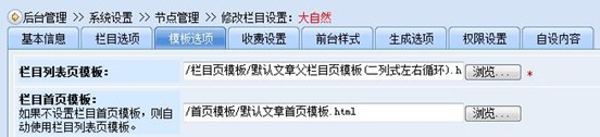 c、“大自然”節(jié)點(diǎn)的模板選項(xiàng)設(shè)置了“欄目列表頁(yè)模板”、“欄目首頁(yè)模板”及“內(nèi)容頁(yè)模板”。