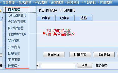 如果說SiteFactory? 1.0的菜單是功能的改進(jìn),那么新版本的菜單將是便利性的改進(jìn)。新版本將常用功能和拗口菜單名稱進(jìn)行了添加和修改,更符合大家的操作習(xí)慣。比如,“信息管理”、“專題管理”兩個(gè)菜單,被“內(nèi)容管理”所取代,這樣更利于操作和理解。
