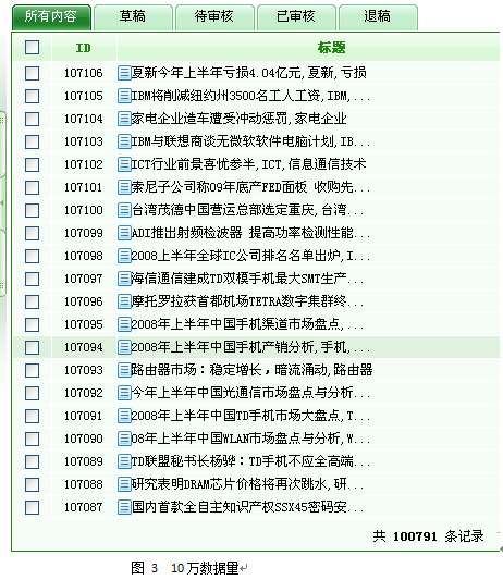 動易SiteFactory的前臺是否可以承載100萬數(shù)據(jù)量,要看模板和標(biāo)簽的合理設(shè)計、數(shù)據(jù)庫對應(yīng)的優(yōu)化。不過從測試來看,官方提供的模板和標(biāo)簽還是比較合理的,能夠輕松承載100萬的數(shù)據(jù)量。