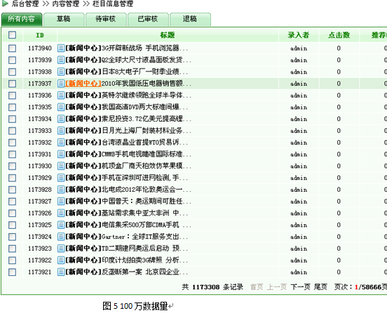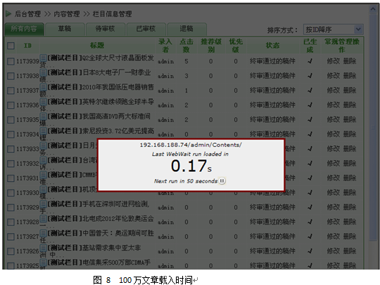 小結(jié):動易SiteFactory的后臺管理可以輕松承載100萬的數(shù)據(jù),并且和10萬數(shù)據(jù)時相比,沒有任何性能上的衰減。無論是10萬數(shù)據(jù)還是100萬數(shù)據(jù),后臺管理的幾個主要頁面的打開時間都在0.2秒以內(nèi),可以說是“閃電”來形容,絕對是“飛快”的級別。