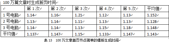 小結(jié):動易SiteFactory2.0的首頁的訪問速度可以說用“飛快”來形容,無論是10萬數(shù)據(jù)還是100萬數(shù)據(jù),無論是簡單模板還是復(fù)雜模板,首頁的HTML生成速度都在3秒左右。從數(shù)據(jù)中也可以看出來,同樣的模板時,10萬數(shù)據(jù)和100萬數(shù)據(jù)在生成HTML時沒有太大的性能差異,但模板的復(fù)雜度則直接影響了生成速度,模板越復(fù)雜,調(diào)用的標(biāo)簽越多,性能衰減得越厲害。