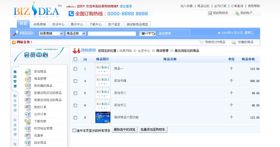 為了提高會(huì)員購(gòu)物體驗(yàn),BizIdea2.5版系統(tǒng)在前臺(tái)會(huì)員中心新增了“我最近瀏覽過(guò)的商品”功能,可以對(duì)前臺(tái)會(huì)員所有的商品瀏覽歷史進(jìn)行記錄。會(huì)員可以在會(huì)員中心中查看自己曾瀏覽商品的名稱、單位及價(jià)格信息,也可直接將商品從列表中刪除或批量添加至購(gòu)物車。(如圖)