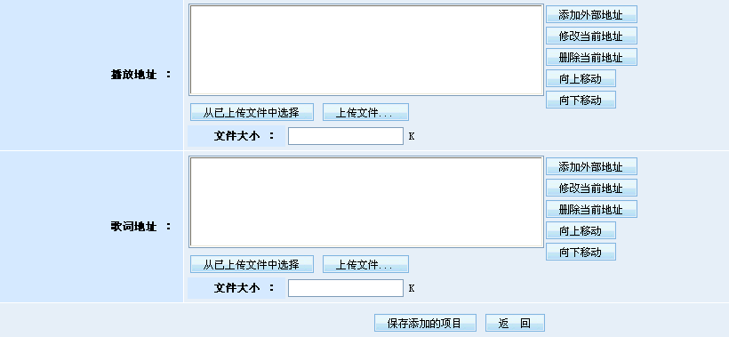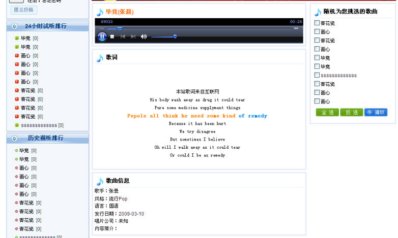 同時(shí),新增的音樂(lè)模型還還配置了專(zhuān)門(mén)的前臺(tái)頁(yè)面模板,內(nèi)置了一系列標(biāo)簽,如24小時(shí)試聽(tīng)排行、歷史試聽(tīng)排行、網(wǎng)友推薦歌曲等,前臺(tái)用戶(hù)可以直接點(diǎn)擊這些排行榜單,迅速找到各種熱門(mén)歌曲,可以選擇多個(gè)歌曲進(jìn)行連續(xù)播放,可以隨機(jī)播放歌曲,可以自動(dòng)播放LRC歌詞。另外,系統(tǒng)還可以支持根據(jù)音樂(lè)名稱(chēng)、歌手、風(fēng)格、唱片公司等進(jìn)行音樂(lè)搜索,以及更復(fù)雜的高級(jí)搜索功能。