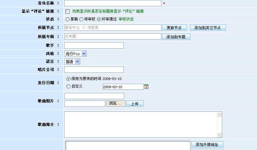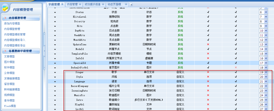 在新增的音樂(lè)模型里,系統(tǒng)已經(jīng)預(yù)置了一系列的相關(guān)字段,包括歌詞地址、播放地址、歌曲簡(jiǎn)介、歌曲圖片、發(fā)行日期、唱片公司、語(yǔ)言、風(fēng)格、歌手等等,并根據(jù)不同字段的特點(diǎn)選擇了不同的字段類(lèi)型。當(dāng)然,網(wǎng)站管理員也可根據(jù)自身需要自行添加其它更多的字段。