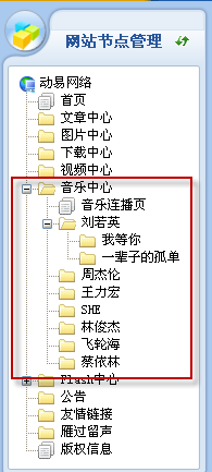 系統(tǒng)也內(nèi)置了音樂(lè)節(jié)點(diǎn),可以在音樂(lè)模型節(jié)點(diǎn)下通過(guò)添加子節(jié)點(diǎn)或者建立專(zhuān)題的方式來(lái)實(shí)現(xiàn)歌手\歌曲專(zhuān)輯分類(lèi)功能。