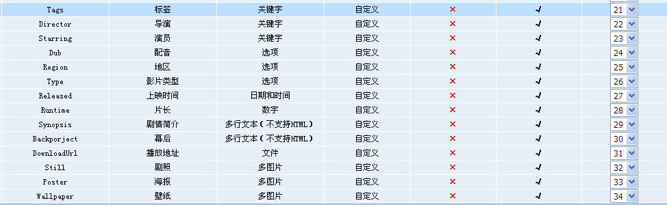 在視頻模型中,新增的自定義字段多達(dá)十幾個(gè),包括:標(biāo)簽、演員、導(dǎo)演、配音、地區(qū)、影片類(lèi)型、上映時(shí)間、片長(zhǎng)、劇情介紹、幕后、播放地址、劇照、海報(bào)、壁紙等等,基本可以滿(mǎn)足站長(zhǎng)對(duì)構(gòu)建視頻模塊的常見(jiàn)需求,另外站長(zhǎng)還可自行新增字段或者對(duì)已有字段進(jìn)行修改,以滿(mǎn)足自己的更多個(gè)性化需求。