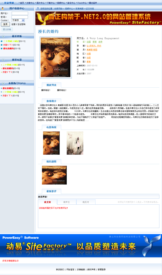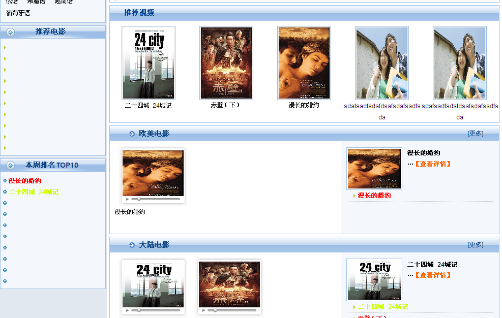 而在視頻模型專(zhuān)門(mén)配置的前臺(tái)頁(yè)面模板中,還內(nèi)置了一系列的標(biāo)簽,如分類(lèi)檢索、推薦電影、本周排名、新片速遞、推薦視頻、最新影評(píng)等等,前臺(tái)用戶(hù)可以在線(xiàn)觀看視頻、可以按標(biāo)簽、演員、導(dǎo)演、配音、地區(qū)、影片類(lèi)型、上映時(shí)間、片長(zhǎng)、劇情介紹、幕后等字段對(duì)站內(nèi)視頻進(jìn)行搜索,可以對(duì)視頻發(fā)表評(píng)論,還可以查看到各種視頻排行榜單。