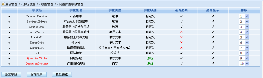 可自定義問答類型,滿足各行業(yè)細分要求。如在軟件銷售行業(yè)中,將問答類型設置為產(chǎn)品版本、錯誤號、提示信息等與軟件使用相關的問答選項,可建立軟件公司自己的售后服務中心(商業(yè)或非商業(yè));又如在硬件銷售行業(yè)中,作為硬件產(chǎn)品的客服中心可以添加硬件的產(chǎn)品型號、購買日期、購買地點、故障信息描述等問題模型字段,等等。通過模型強大的自定義字段功能,滿足各種行業(yè)的不同需求。