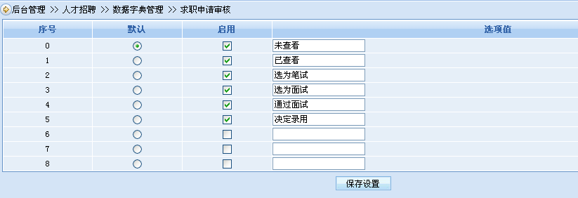 為了用戶可以更好地對(duì)系統(tǒng)進(jìn)行自定義管理,以滿足自己的個(gè)性化需求,系統(tǒng)內(nèi)置了數(shù)據(jù)字典管理功能,用戶可以對(duì)職位類型、工作經(jīng)驗(yàn)、職位狀態(tài)、行業(yè)類別、公司規(guī)模等等字段選項(xiàng)進(jìn)行自定義填寫。