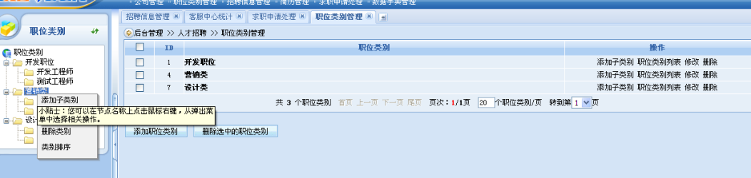 可對(duì)所有招聘職位進(jìn)行良好管理。系統(tǒng)可以自由添加最多二級(jí)的不同招聘職位類別,并且可通過(guò)直接點(diǎn)擊右鍵的方式來(lái)實(shí)現(xiàn)便捷添加子類別。